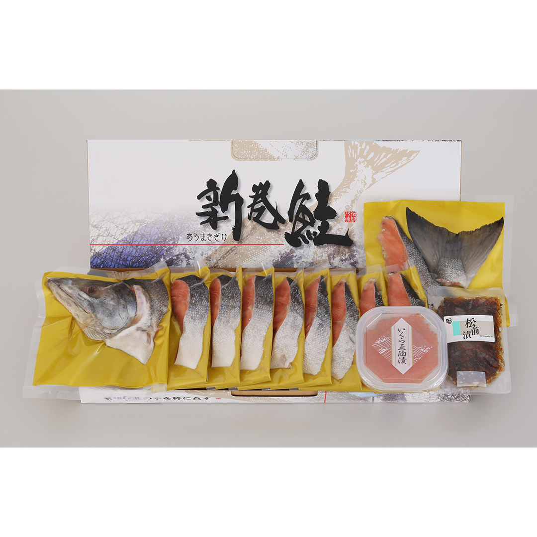 ◎内容:新巻鮭半身(北海道産)/約800g(1切個包装)、松前漬/100g、いくら醤油漬(北海道産)/70g
