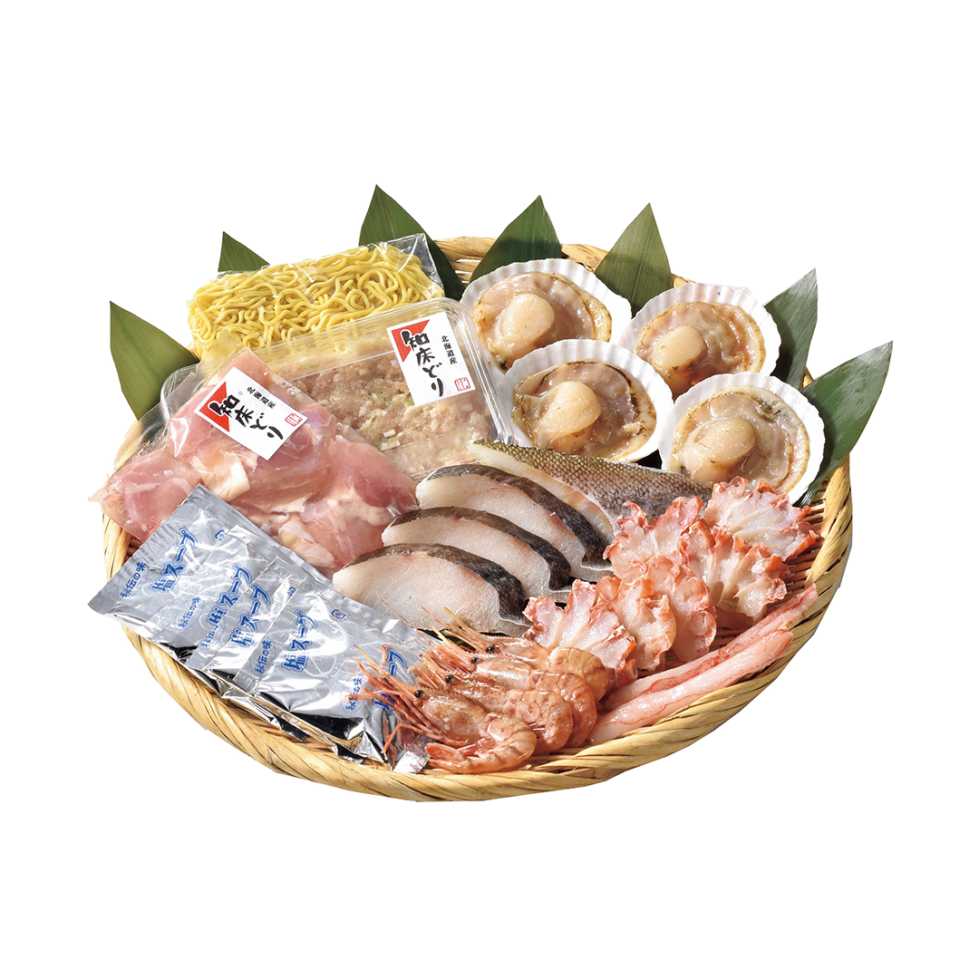 ◎内容:知床どりつみれ(北海道産)/140g、知床どりモモ(北海道産)/90g、北海道産生紅ずわいがに/100g、真鱈切身/4切(約120g)、ぼたんえび(北海道産)/4尾、ほたて片貝(北海道産)/4枚、ラーメン/110g、塩スープ/38g×4