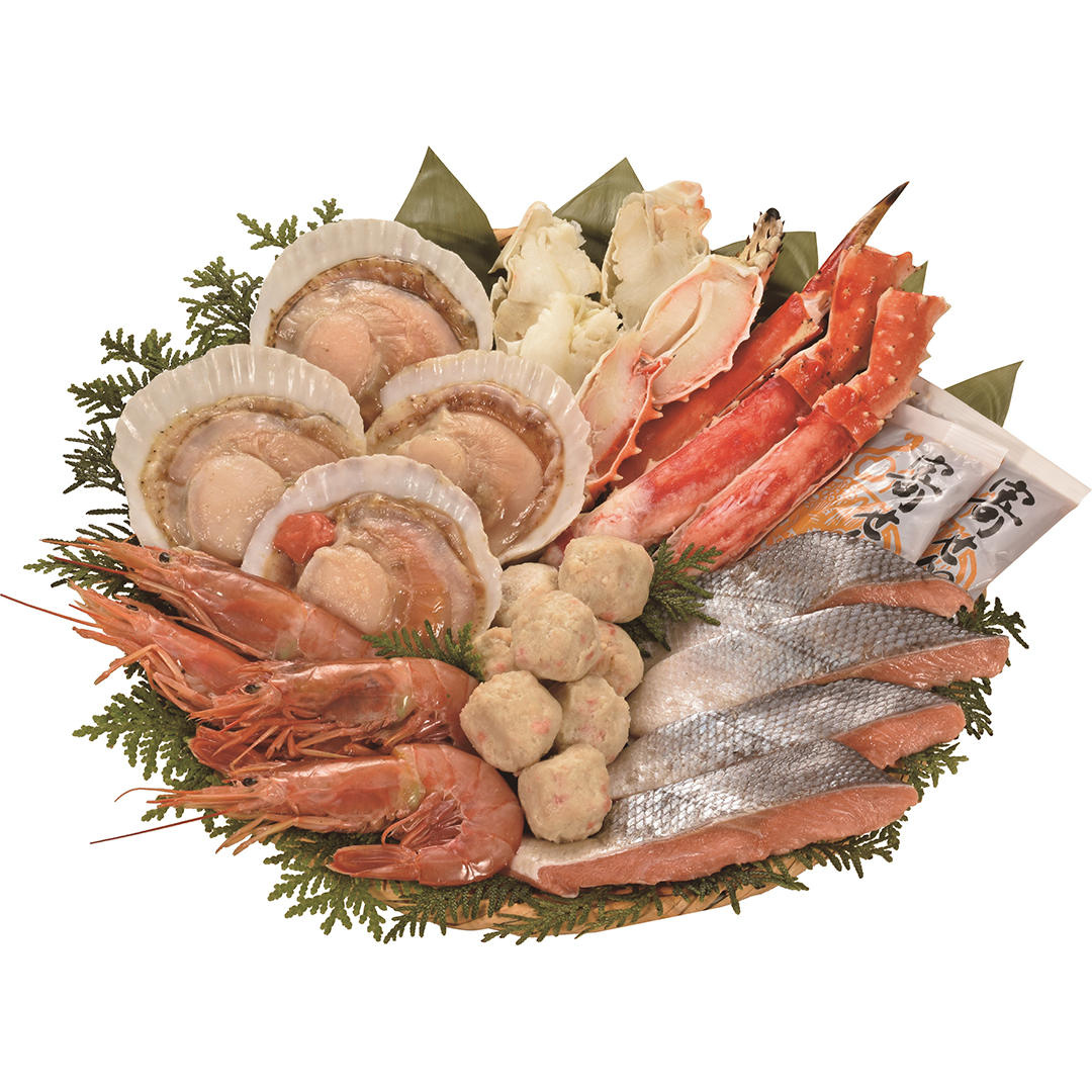 ◎内容:ロシア産ボイルたらばがにハーフポーション/300g、北海道産ほたて片貝/4枚、アルゼンチン産赤えび/4尾、かにつみれ/8玉、北海道産秋鮭切身/40g×4、鍋用たれ(醤油味)/50g×2