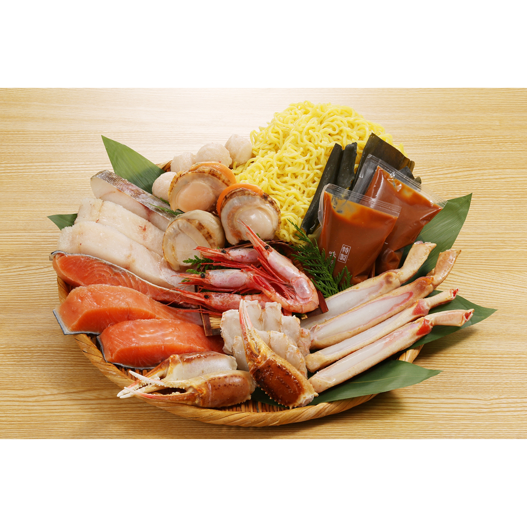 ◎内容:生ずわいがに(ロシア産) /(脚4、爪3、肩カット100g)計275g、秋鮭・たら・ほたて(北海道産) /各3(計490g)、甘えび・団子/ 各4(計130g)、ラーメン/400g、昆布、みそ鍋つゆ/80g×2