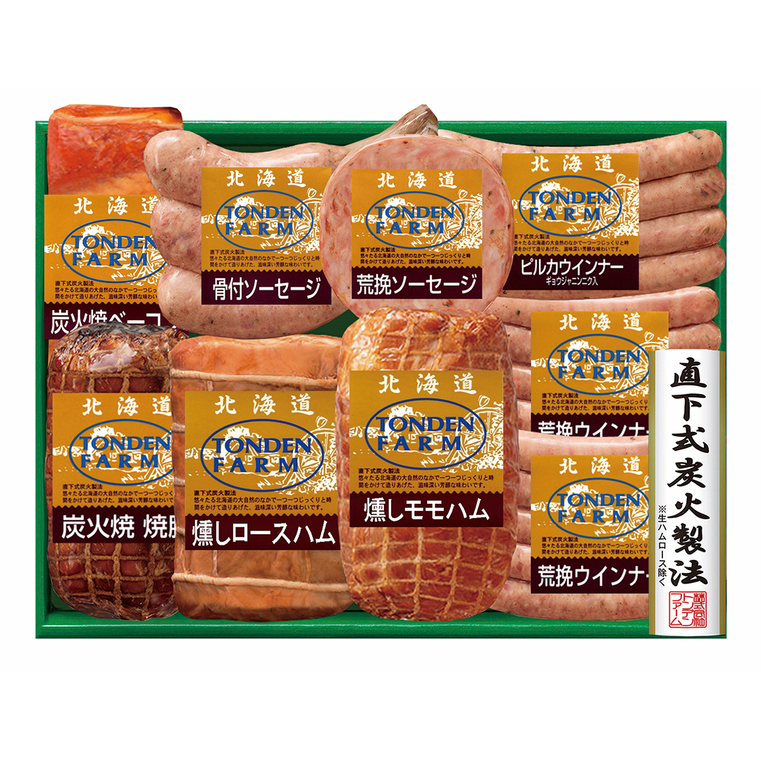 ◎内容:炭火焼ベーコンブロック/300g、荒挽ソーセージ/70g、荒挽ウインナー/100g×2、ピルカウインナー/120g、燻しももハム/300g、骨付ソーセージ/180g、炭火焼焼豚/200g、燻しロースハム/300g