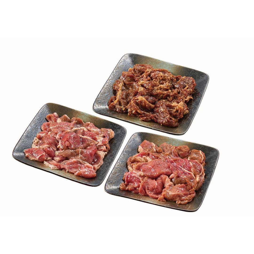 ◎内容:味付ラム(ニュージーランド産)・塩ジンギスカン(オーストラリア産)・味付牛カルビ(北海道産)/各200g