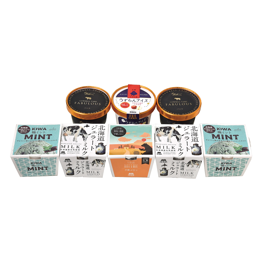 ◎内容:長沼あいす 夕張メロン/100ml、チョコミントアイス~極ミント~/100ml×2、ファビラス バニラ/90ml×2、室蘭うずら園 りんご/110ml、長沼あいす ミルクジェラート/100ml×2