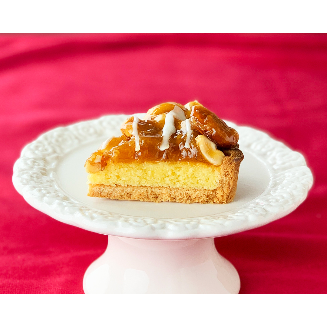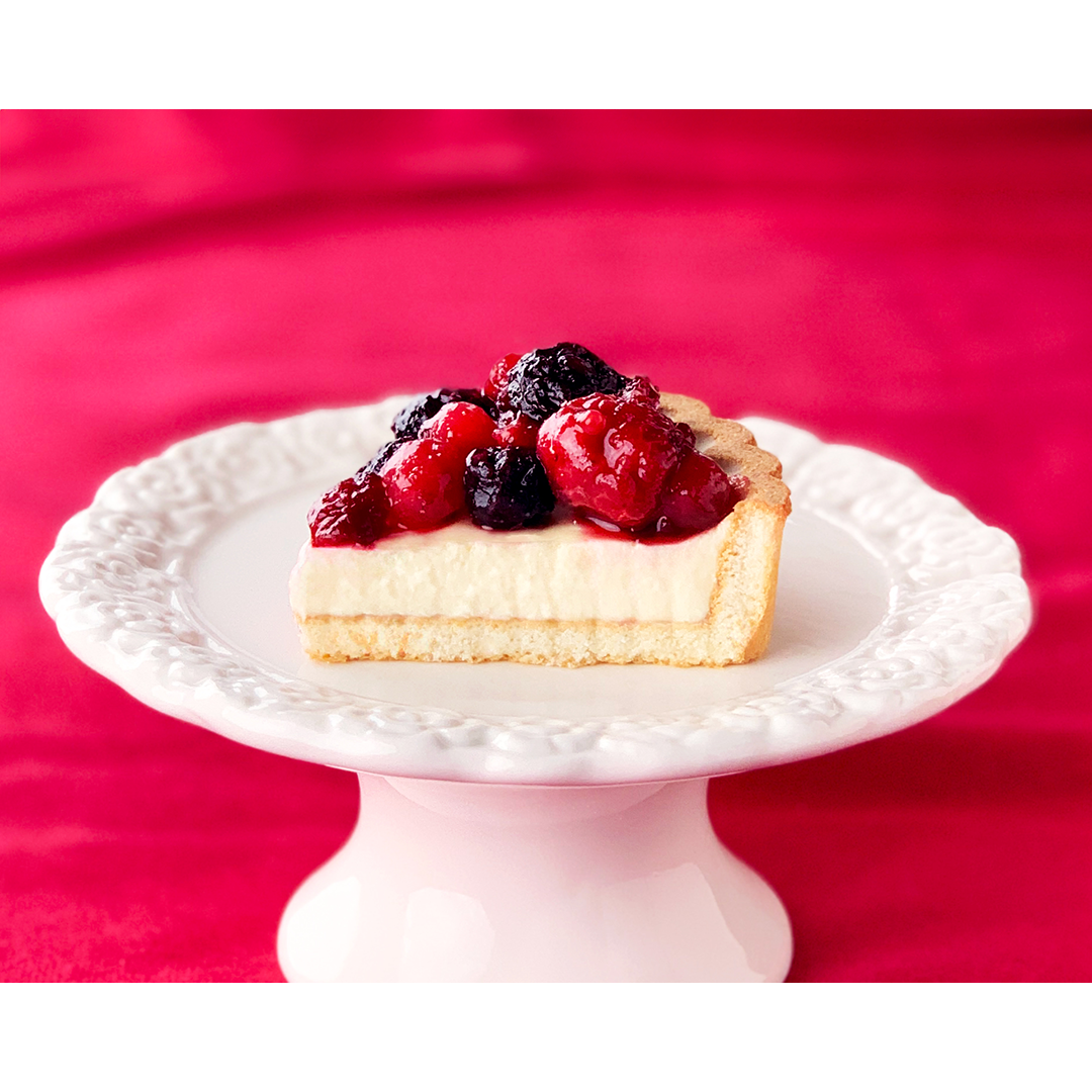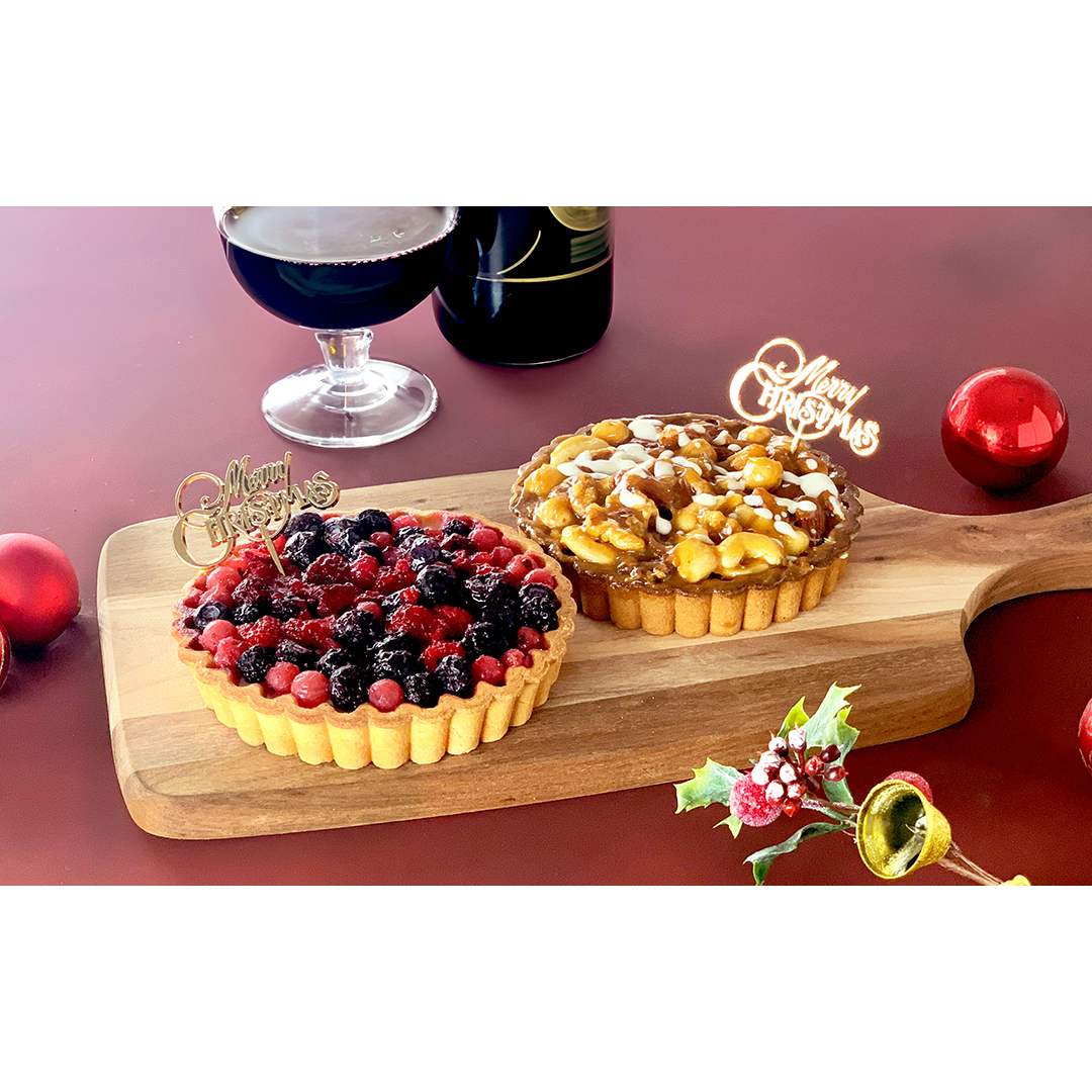 香ばしタルト生地にナチュラルチーズと北海道産生クリームを使用したレアチーズをたっぷりしきつめ甘酸っぱい4種類のベリーをトッピングしたタルトと、アーモンド風味のスポンジケーキにキャラメルソースと4種類のナッツをトッピング。