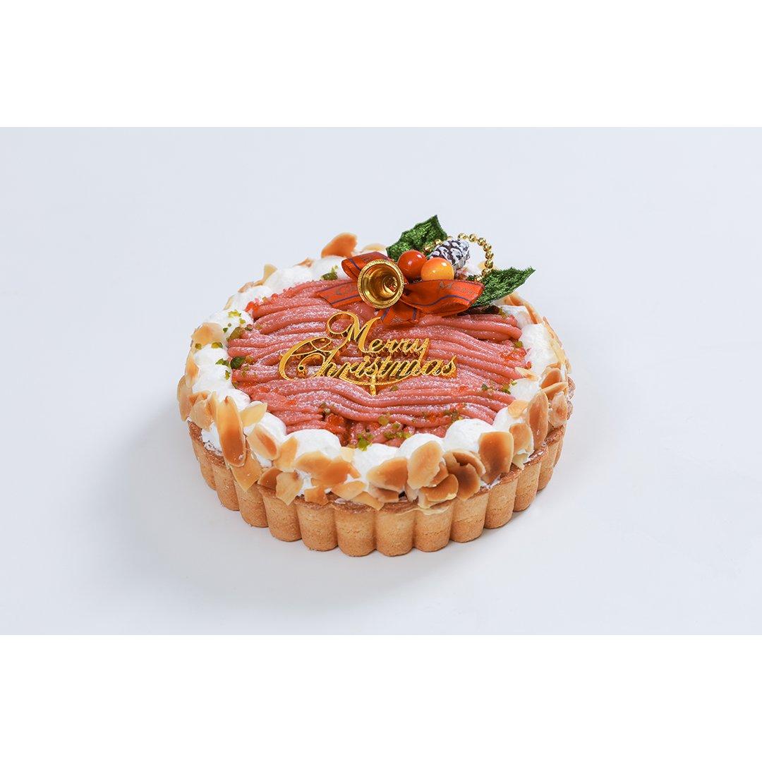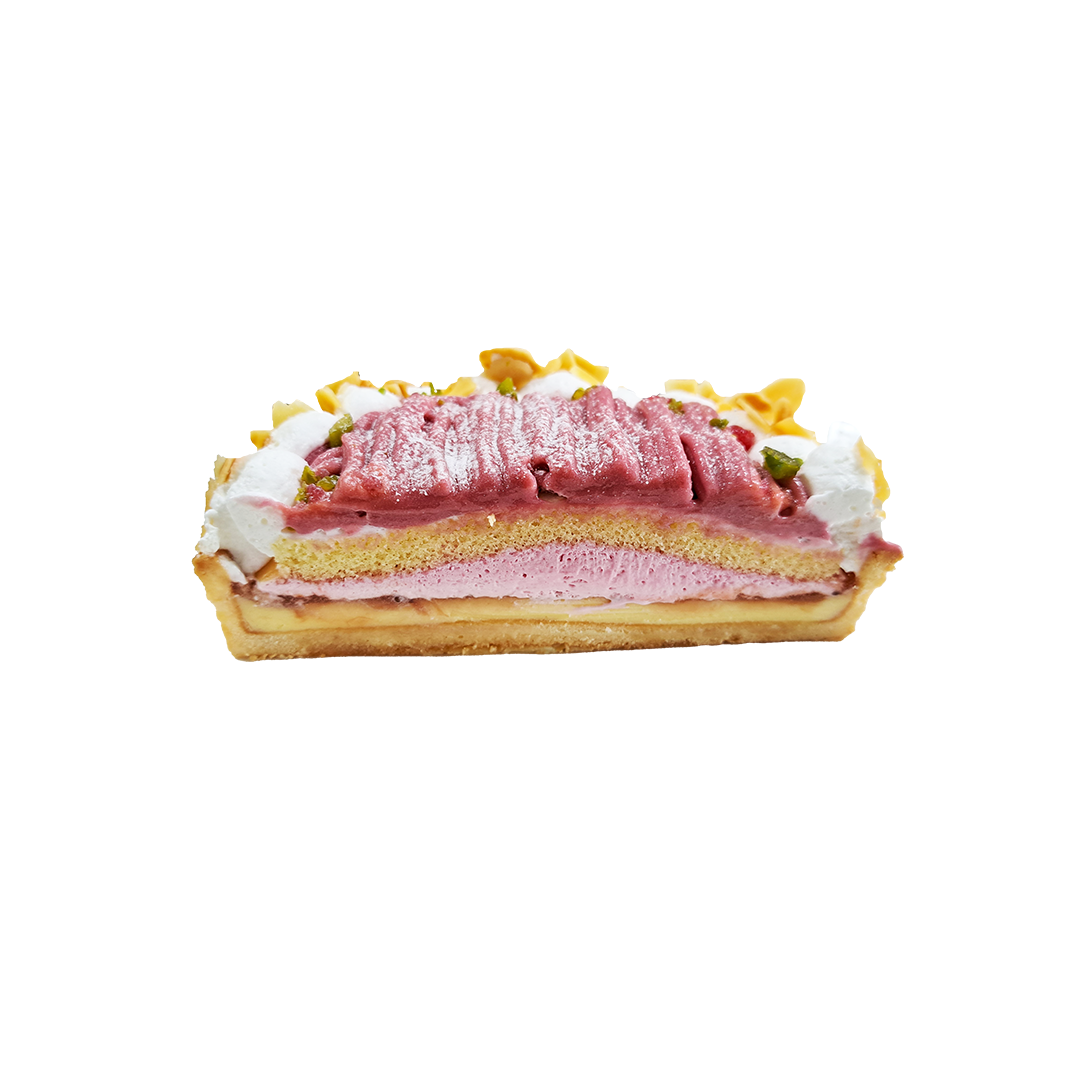 タルトに濃厚なベイクドチーズケーキを流し焼き上げてから、苺のジャム、苺のホイップ、スポンジ、ホイップを重ね上げ、全体を苺のマロンペーストで覆いました。トッピングに甘酸っぱいラズベリー顆粒、食感のピスタチオとアーモンドスライスを合わせました。