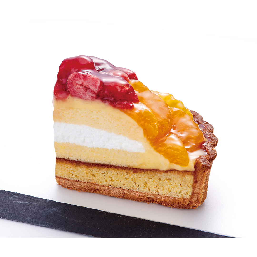 ホイップクリーム、スフレ生地、カスタードクリームを盛ったタルトの表面にみかん、甘夏みかん、ピーチ、パイン、若桃、イチゴを贅沢に盛りつけました