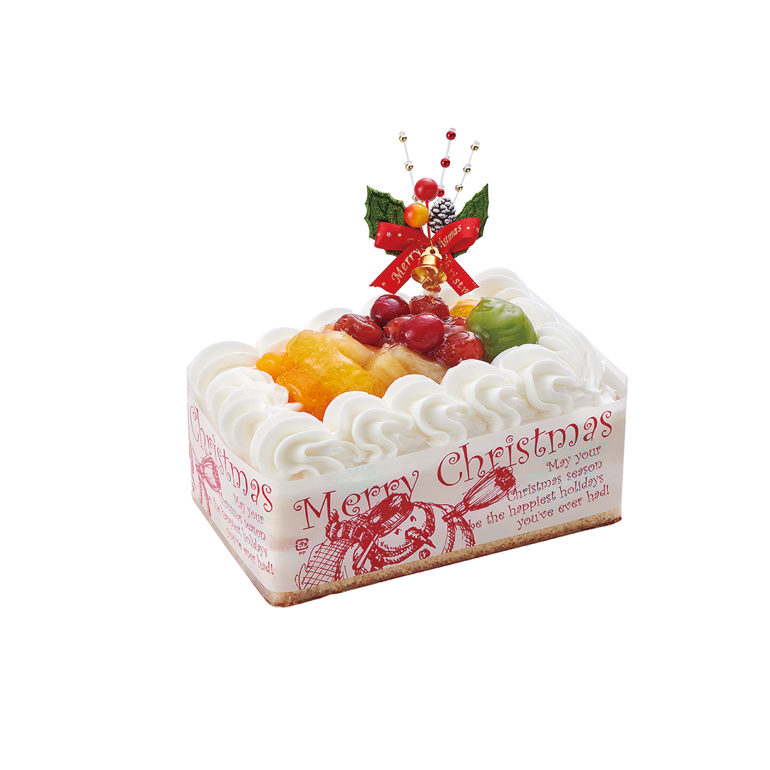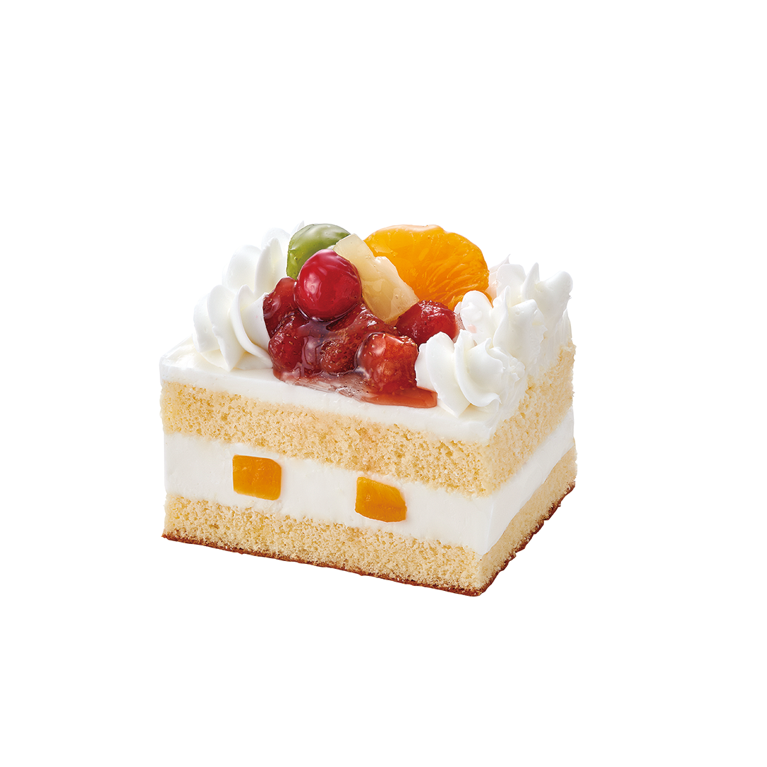みかん、イチゴ、パイン、甘夏みかん、ピーチ、若桃、マンゴー、クランベリーをトッピングしたスクエアタイプのフルーツケーキです。 北海道産生クリームを使用し、ピーチをサンドしています